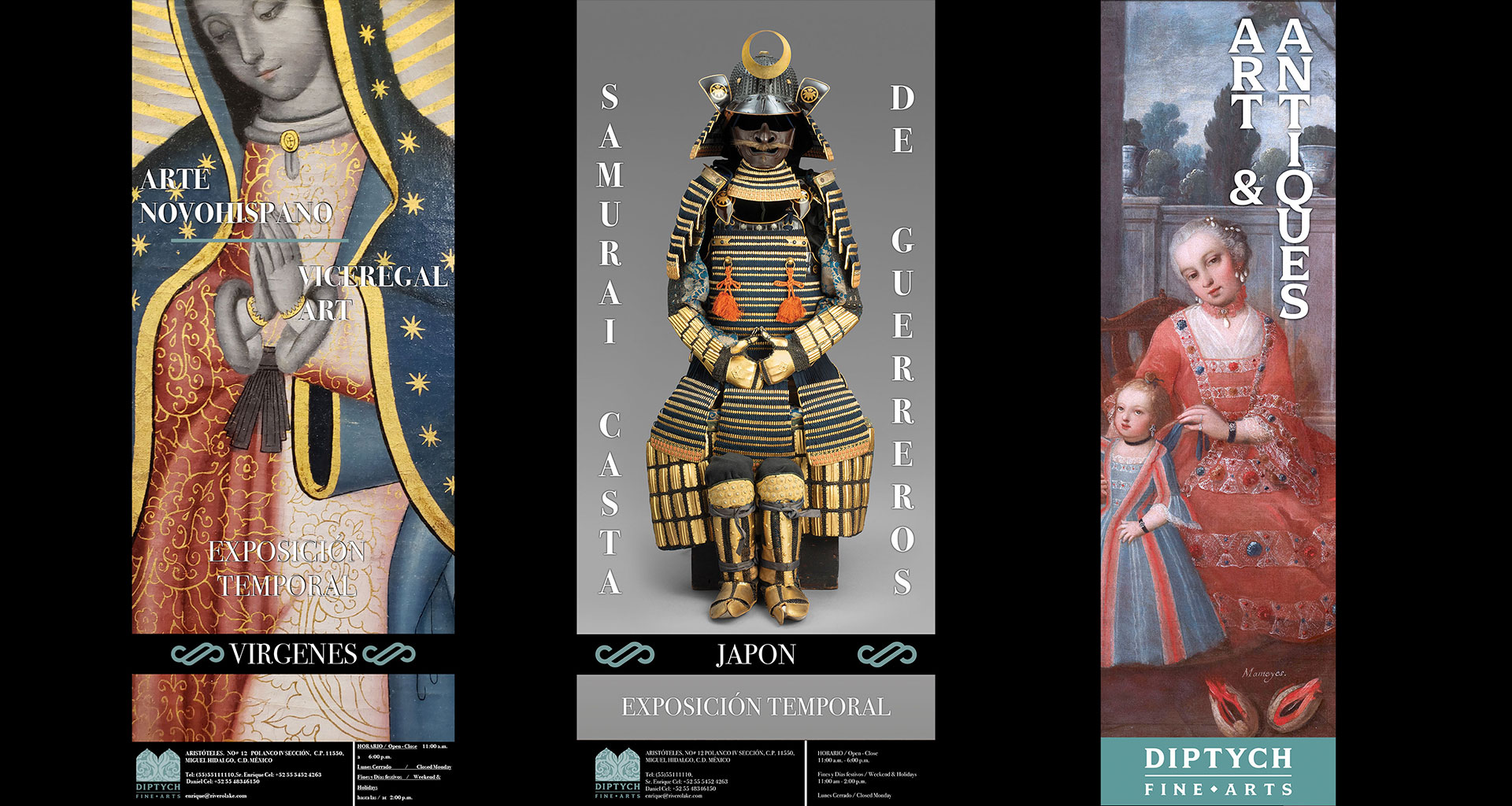 Diseñamos y adaptamos piezas gráficas en gran formato para la Galería de Antigüedades Diptych, enfocándonos en mantener la elegancia y el carácter artístico de cada obra. Todas las piezas fueron producidas con alturas mínimas de 3 metros, optimizadas para impresiones de alta calidad en muros, acompañadas por versiones adaptadas para estructuras tipo araña de hasta 1.6 metros, cuidando cada detalle visual para lograr una exhibición imponente y estética.